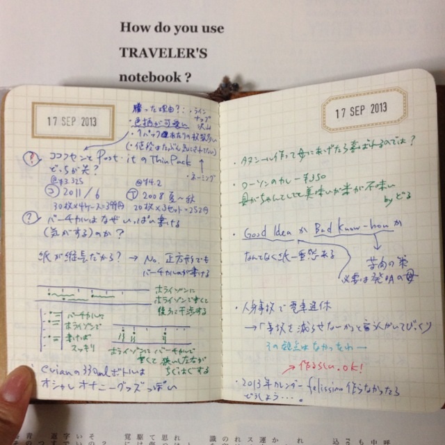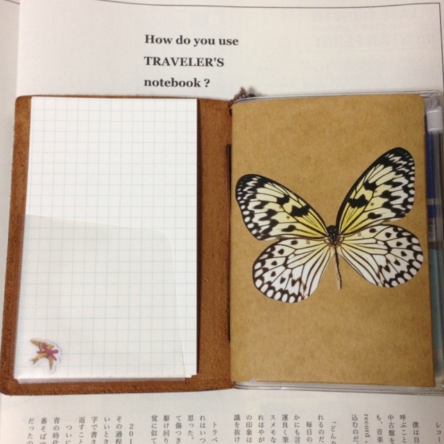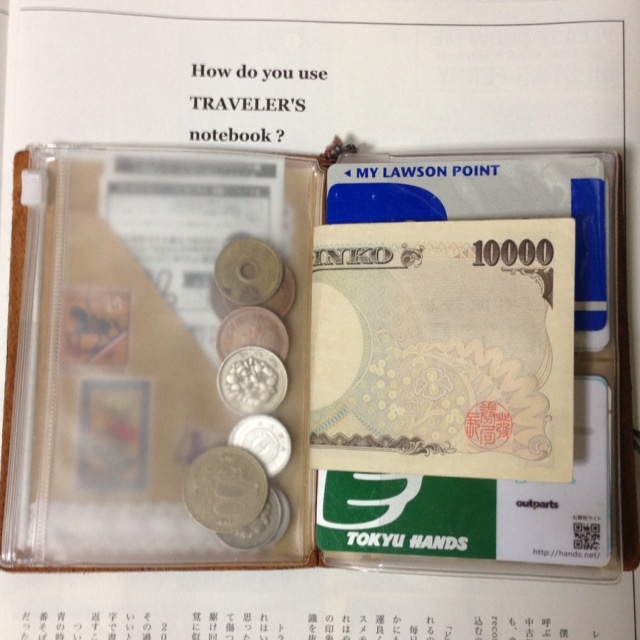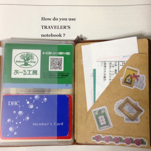 2013/09/22 Category : Stationery うちの子じまん(トラベラーズノートパスポートサイズ編) 買ってから5ヶ月。財布兼メモ帳に使っています。 カバーには100円ショップのSeriaで買った、レーステープを貼っています。チャームもSeria。4つで105円(税込)でした……。表紙の裏に3×5情報カードを数枚ストックしています。本のしおりにしつつ読書メモをとったり、スタンプや万年筆のインクを吸わせたりします。クラフトファイルに貼ってる蝶のシールは、IKEAのインテリアステッカーです。クラフトファイルの左側をレシートいれ、ジッパーケースを小銭入れにしてます。クラフトファイルの右側はクーポン類。クラフトファイルの裏にも蝶ステッカー。住所・名前のスタンプを押してあります。入れているノートは、DECOLEというメーカーのパスポートサイズ窓開きノート。ノートの1ページ目には、好きなタカラジェンヌさんの写真シールを貼ってデコっています。ノート表紙の窓から、裸足がのぞくように貼ってますwノートに書いているのは、通勤中や仕事中に思いついたこと。頭の中に考えがブワーッと出てきてソワソワしたとき、書き出して落ち着いてます。ノートの隅に予め枠が印刷されているので、帰宅してから、Shinyのデートスタンプで日付を押します。ノートの最後のページには、マステをストックしてます……が、使ったことないですね。トラベラーズノートレギュラーサイズの方は、また後日。 [6回]PR