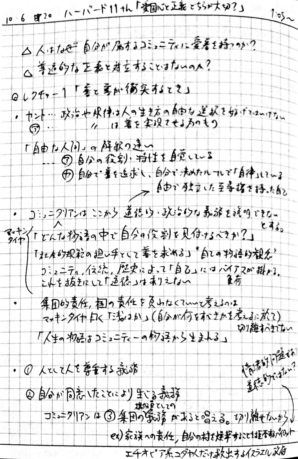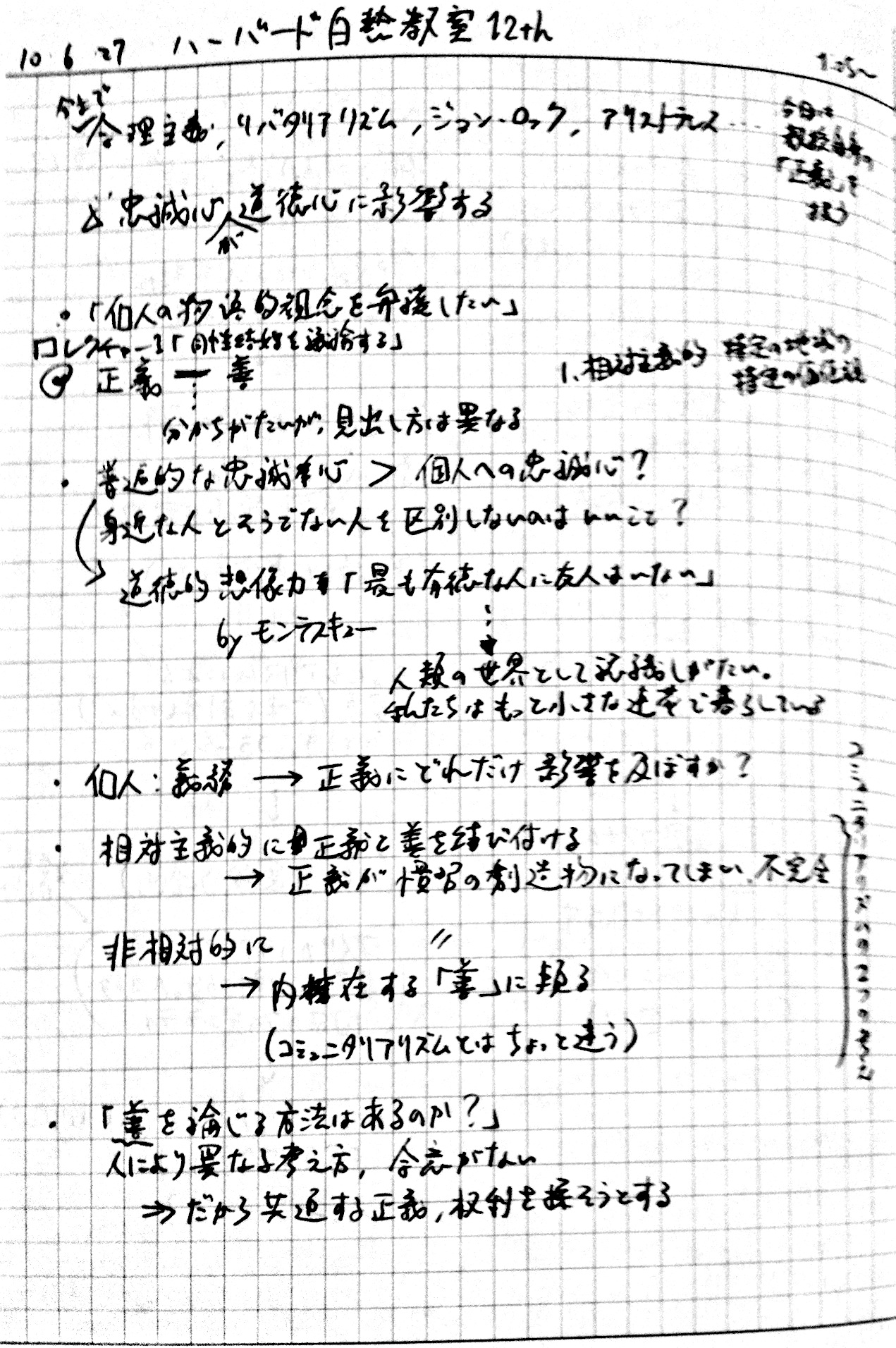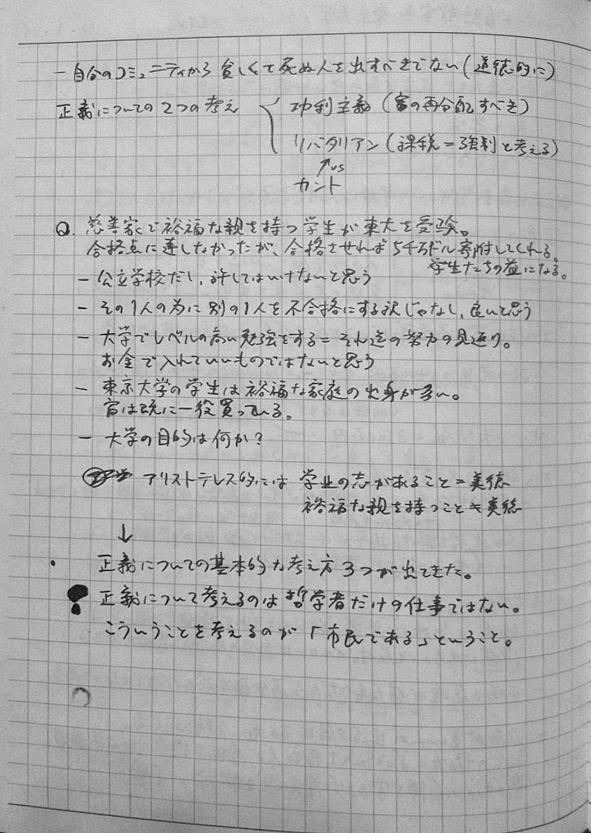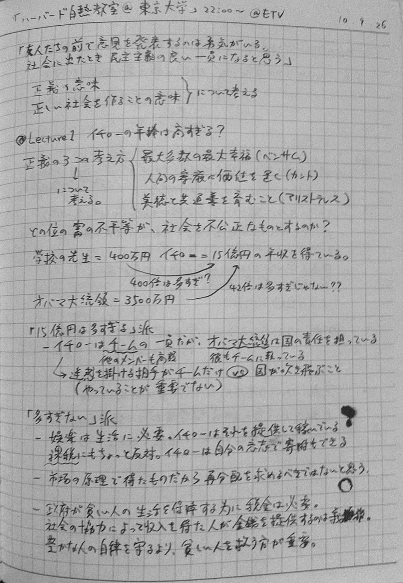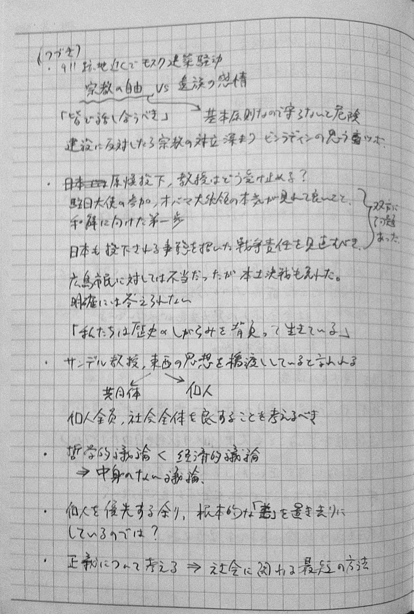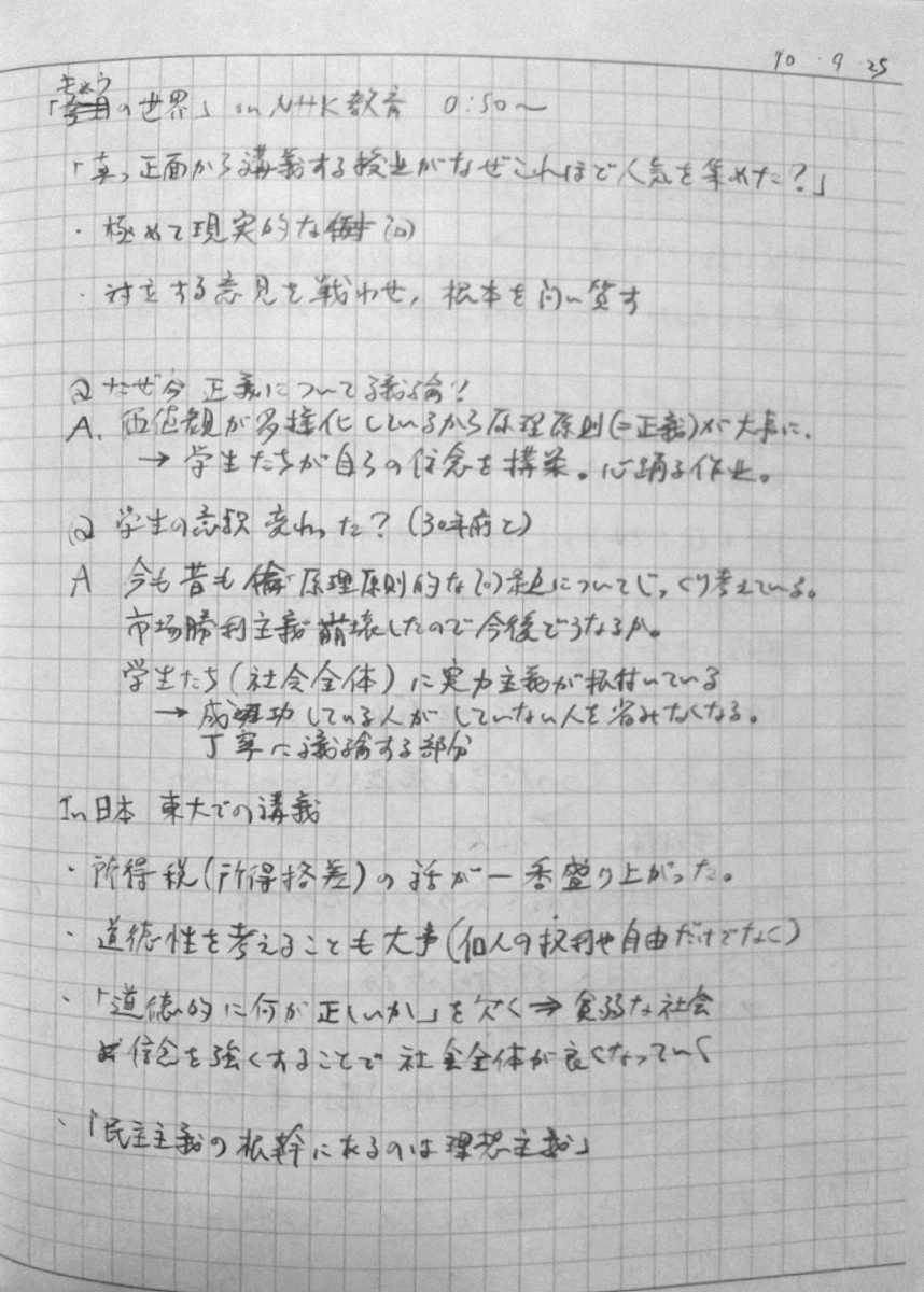 2010/09/27 Category : TV おまけ。インタビュー番組「いま"正義"を考える ~”白熱教室”サンデル教授に迫る~」のノート ノーチェックだった人もいるっぽいので、ついでにup。2010年9月26日、深夜0:50~ NHK総合で放送されたサンデル教授へのインタビュー番組「いま"正義"を考える ~”白熱教室”サンデル教授に迫る~」見ながら取ったノートです。毎度汚くて申し訳ない。時間見つけてちゃんとしたスキャナで撮りなおしてupしなおそうかなとも考えています。 [0回]PR
