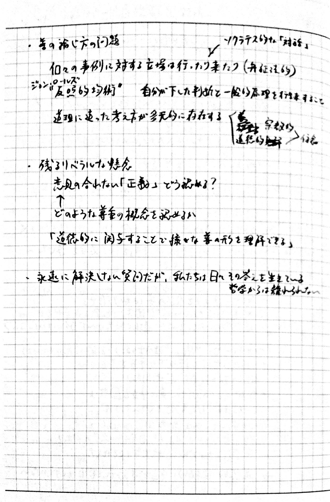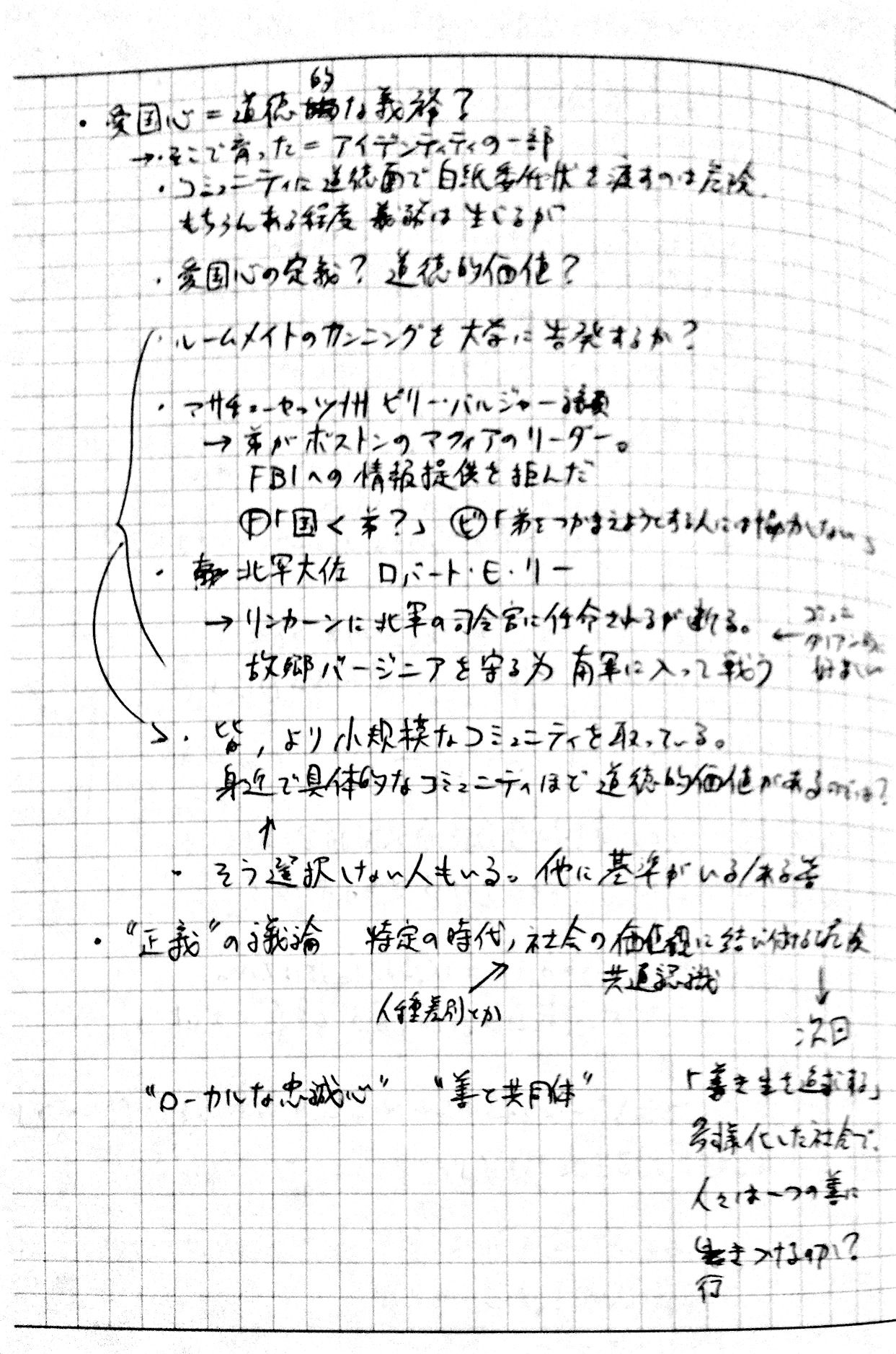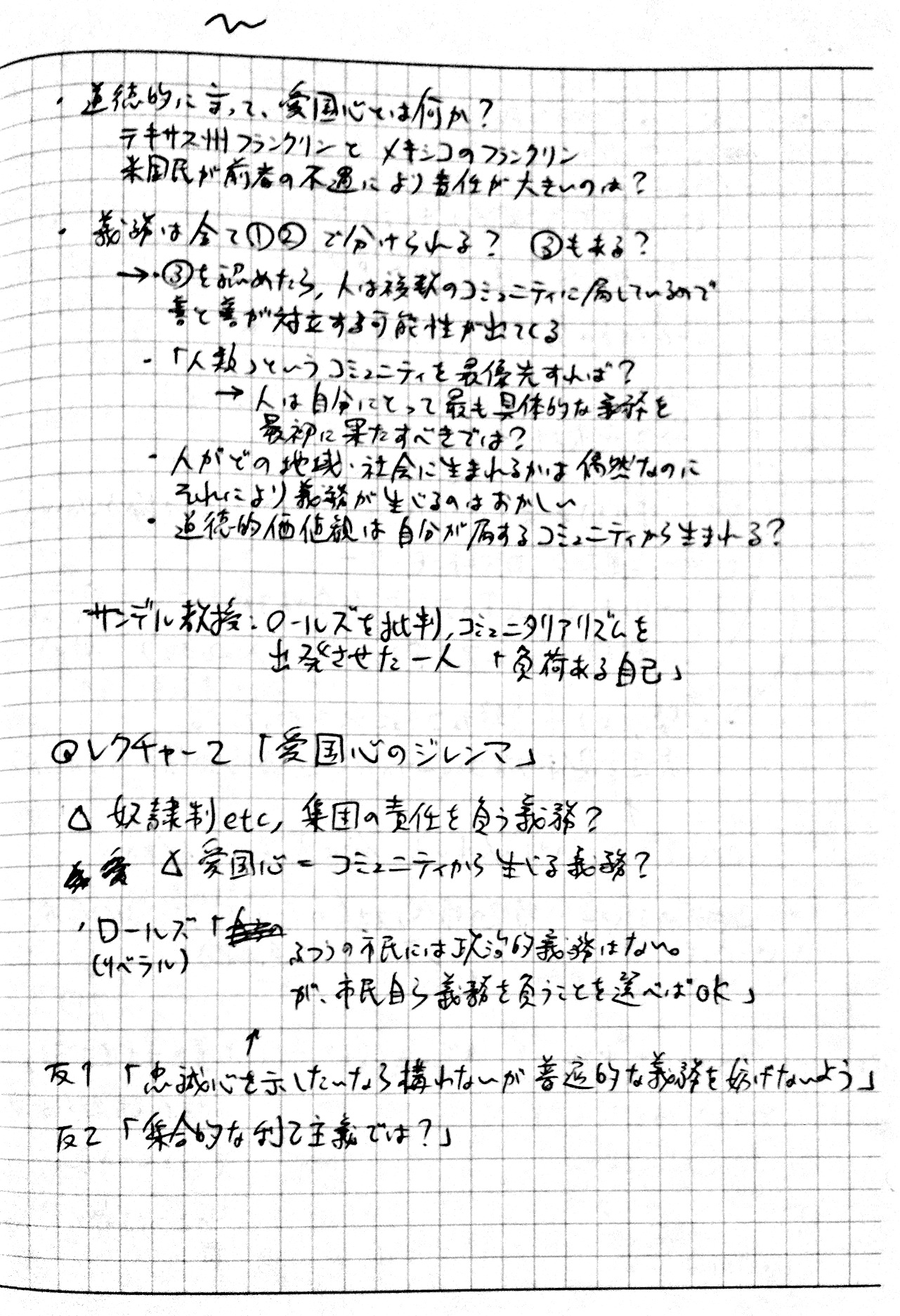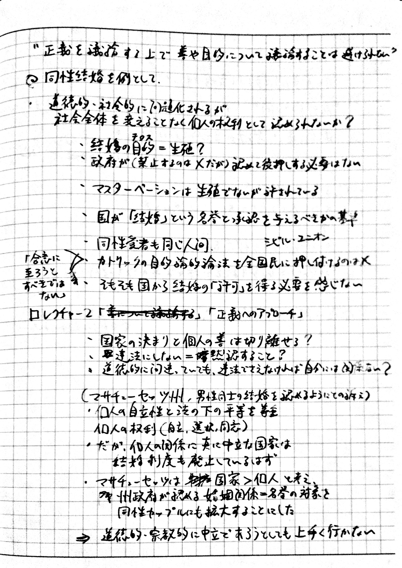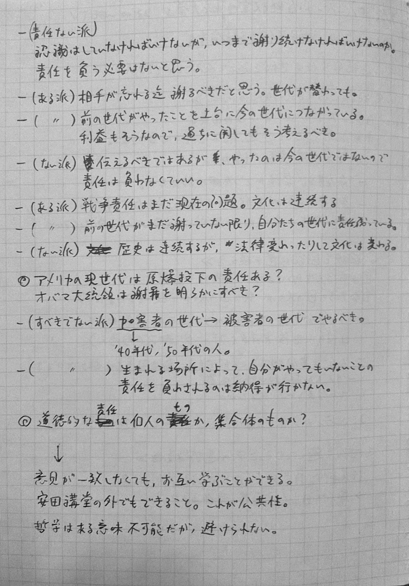 2010/09/27 Category : TV おまけ。インタビュー番組「いま"正義"を考える ~”白熱教室”サンデル教授に迫る~」のノート ノーチェックだった人もいるっぽいので、ついでにup。2010年9月26日、深夜0:50~ NHK総合で放送されたサンデル教授へのインタビュー番組「いま"正義"を考える ~”白熱教室”サンデル教授に迫る~」見ながら取ったノートです。毎度汚くて申し訳ない。時間見つけてちゃんとしたスキャナで撮りなおしてupしなおそうかなとも考えています。 [0回]PR