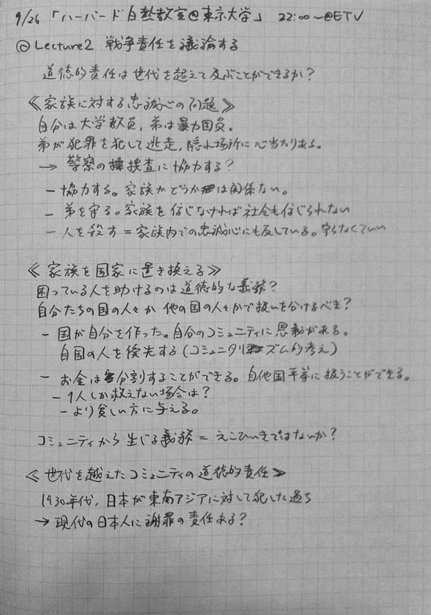 2010/09/27 Category : TV 「ハーバード白熱教室@東京大学 日本で正義の話をしよう」のノートです(Lecture2) 「ハーバード白熱教室@東京大学 日本で正義の話をしよう」のノート、今度はLecture2。「我々が最も感情的になる」愛国心の問題。サンデル教授が選んだのは、その中でも戦争責任について。日本→東南アジア、あるいは米国→日本の。こちらもまとめは「議論をすることこそ民主主義の下で社会に貢献すること」となっていて、サンデル教授は「議論することの大切さ」を本国でも、今回日本でも教えてくださったんだなぁ、と。 つづきはこちら [0回]