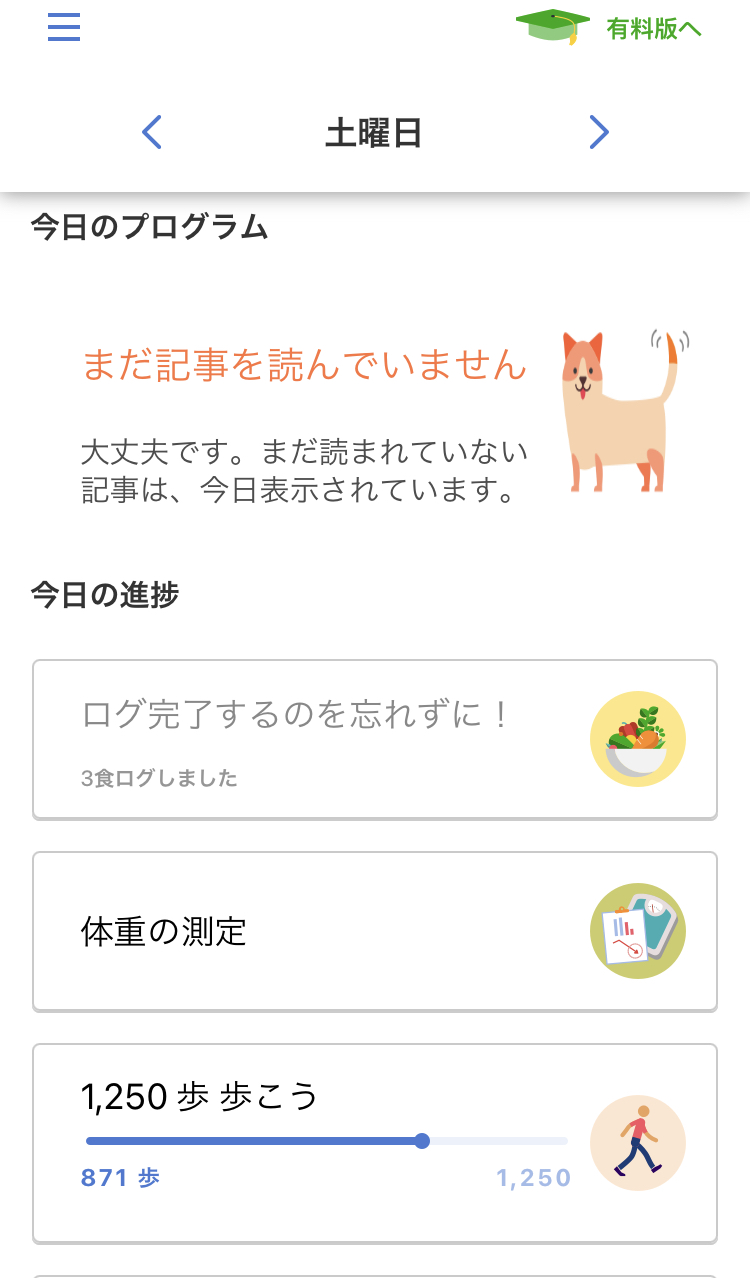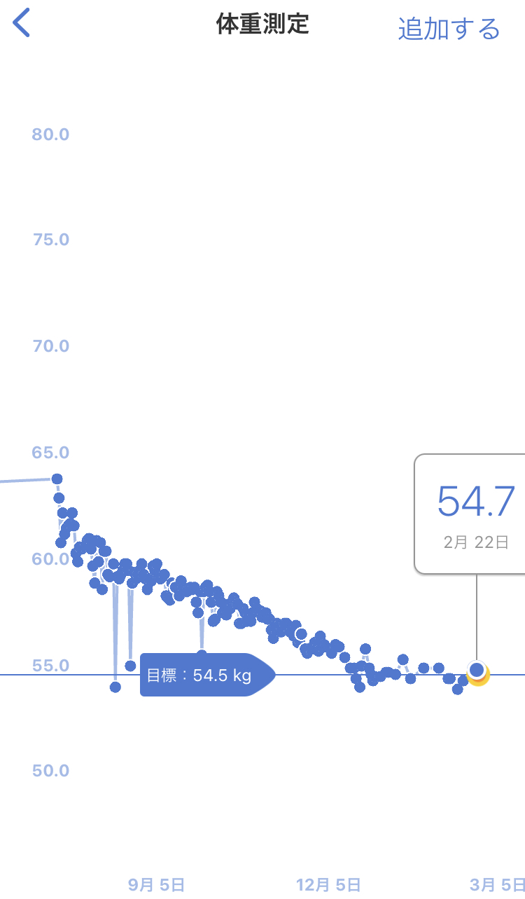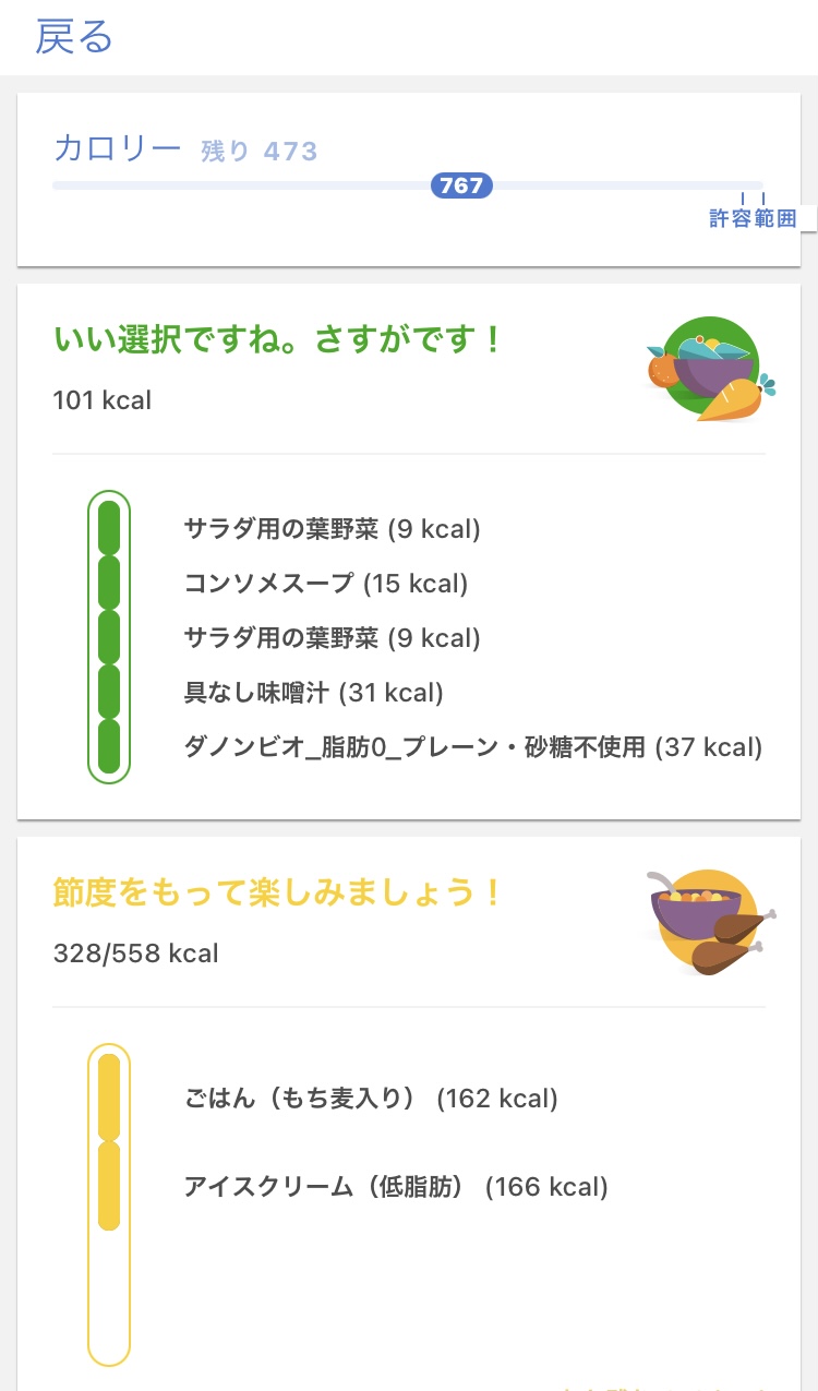 2021/02/28 Category : Life 半年で10kgやせたよ・やったこと記録その1 そうなんです、昨夏から冬にかけてダイエットしてて、10kgやせたんですよ。タイトルにはわかりやすく半年でって書いたけど、2020年8月〜12月だったので、ちゃんとカウントすると5ヶ月ですね。その後リバウンドすることなく生活しています。何をやったかというと、Noomというダイエットアプリに課金しました。無料の体重&食事&運動記録アプリとしても使えます。iPhoneのApp Storeならこちら。過去に支払い・返金トラブルとかあったらしいですけど、私がやったときはふつうに他のアプリ課金みたいにiOSで月々5000円のサブスクリプションとして支払って、やめるときも退会連絡→サブスクリプション解除、で完了でした。コースによって料金が違ったり、キャンペーン適用があったりとかで、月額は変わるみたいですね。わかりづら〜いw App Storeの「App内課金あり」の欄見ると、結構バラつきがある……。このNoomってアプリに引っ張ってもらいながら、自分でも食生活や日々の活動を工夫して減量していった感じです。目標体重を達成した&リバウンドする気配がないので、今は課金をやめて、無料アプリとして使っています。私には「たまたま」合っていた……というだけなので、この記録もひとつの「事例」として読んでください。課金額も多いと思うか見合う額と思うかは人それぞれだと思います。アプリにしては高いけど、ジムとか通うこと考えると安い、みたいな価格帯。私は課金額相応の益が得られたと思っているクチです。なんたって半年で10kg減ったからな。 まずは、私が使ったNoomってこんなアプリだよというのを。立ち上げたときの画面。 1日1ページのやることリスト形式です。有料コースに課金すると、犬のイラストがあるところに、日々のコラムやデイリークエストのようなものが出てきます。(画面は2021/02/28現在のものです。最近アップデートがあって、見た目が少し変わりました。)私が課金していた「Noomプログラム」(月額5000円くらいのやつ)は、4ヶ月に渡り、数週間ずつかけて、体重計に乗る習慣をつけよう低カロリーな食品を増やそう1日の摂取カロリーを「許容範囲」内に収めよう運動する習慣をつけようといった「ダイエットのやり方」を、コラム・デイリークエストを通して教えてくれます。摂取カロリーの「許容範囲」は、性別・年代で最初に割り当てられて、歩数や運動量に応じて上限が上がります。私は今までの人生であまり摂取カロリーを意識してなかったので、棒グラフがここに収まるように心がけるだけで、最初の5kgは2ヶ月くらいでスコーンと減りましたね。あとの5kgは、運動でじっくり落としていった感じです。運動もそんなにヘビーなものでなくて、1日数分、1週間数十分ずつでした。運動目標時間が出されて、達成度に応じてその目標時間がだんだん延びていくんですけど、MAXでも週150分でした。なので1日20数分ずつ、あるいは週3回(1日おきくらい)で50分くらいの長めの運動をする程度でした。Noomの特長として、心理学に基づいたメンタル面のサポートもしてくれます。上述のようなフィジカルなものだけでなく、前向きな見方自己肯定感を高める考え方諦めない、挫折しない考え方といった「ダイエットを諦めずにやり遂げる思考」も、コラム・デイリークエストの中で身につくようになっています。おかげさまで私も陰湿にくよくよすることがだいぶ減ったのですが、元々明るい人間なのであまり変化に気づかれません。おやおや。個人的に一番大きかったのは、「コーチ」と呼ばれる専属の担当者が付いてくれること。この方と、アプリ内のメッセージ機能(LINEみたいな画面です)で、個人的なやり取りができて、相談できたり、励ましてもらえたりするんですね。まぁこの方がめちゃくちゃ明るくて前向き。いっぱい褒めたり励ましたりしてくれて、「じゃあ頑張ろうかな〜エヘヘ」みたいな感じで続けることができました。とはいえ、本国アメリカのメソッドに沿ってるからだと思うんですけど、我々が想像する「陽気なアメリカ人」のノリなので、これが合わなくてNoomやめた〜という方もおられます。それもやむなしだなと思います。まじで明るい「陽キャ」ノリなので。反対に、課金プログラムの中で、自分にとってはそんなに有用じゃなかったな〜と思うのはグループ機能ですね。20〜30人くらいのグループチャットなんですけど、消極的な譲り合いをする日本人的気質には合わないかな〜という個人的な感想です。たぶんアメリカとかのグループセラピーをイメージしてるんだと思うんですけども。日本だと学校の班くらいの規模、5〜6人くらいが一番、お互いに親しみのようなものが感じられ、発言しても黙ってても大丈夫な空気が出て良いんじゃないかと思いますが、日本だけそういうローカライズができるのかはわからないです。アプリの画面をいくつか。体重記録画面。 アプリで直接体重を入力する