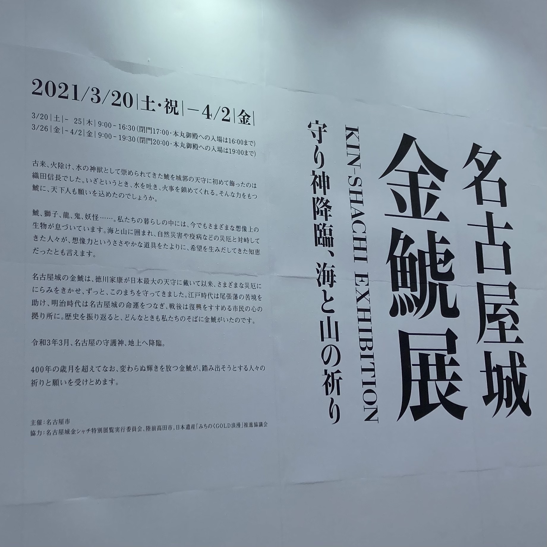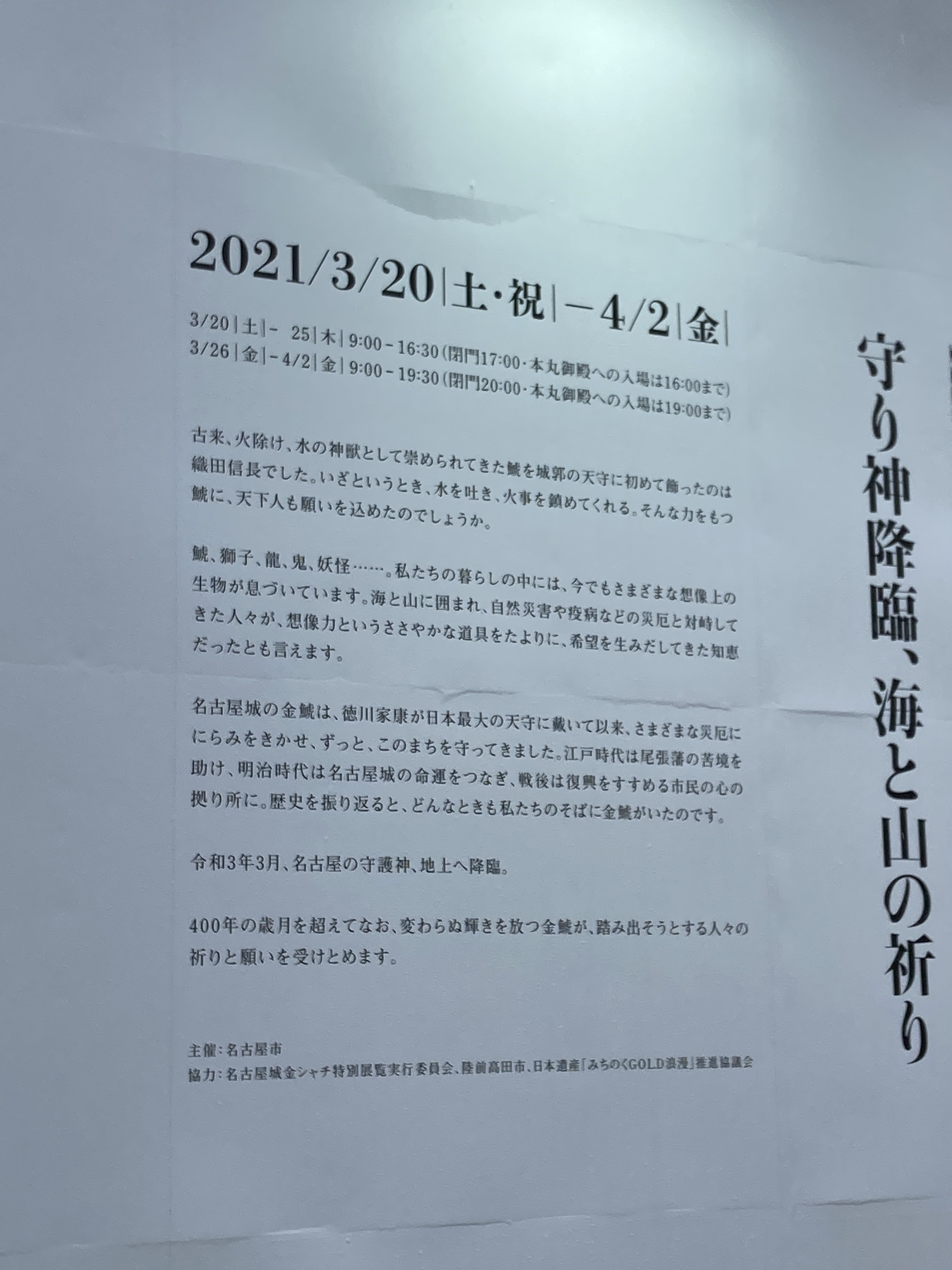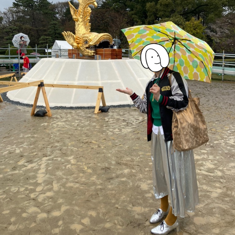 2021/03/27 Category : Reports 名古屋城 金鯱展2021 【公式】名古屋城 金鯱展 [守り神降臨、海と山の祈り] 名古屋城のシンボル・金シャチが、16年ぶりに地上で展示とのことで行ってまいりました。こんな画像でも後年何かの参考になるかな……と思ってアップロードします。 展示解説。 1枚めに載せたのがオスの山シャチ。砂山に載せられています。↓がメスの海シャチ。池に浮かべられています。 シャチホコを前にはしゃぐわたくし。 海シャチ、山シャチについての解説。 イラストレーター2yangさんによる壁画。「鯱ワールド」「妖怪ワールド」の2枚。空いている窓から山シャチが覗ける趣向です。 シャチホコがなくなって、なんだかまぬけな印象の名古屋城。 名古屋城での展示は2021年3月20日(土祝)〜4月2日(金)。2021年4月10日(土)〜7月11日(日)は栄・ミツコシマエ ヒロバスで特別展覧が行われます。【公式】名古屋城金シャチ特別展覧 特別展覧の方は刀剣乱舞とのコラボもあるので、こちらも行きたいな〜と思っています。 [0回]PR
