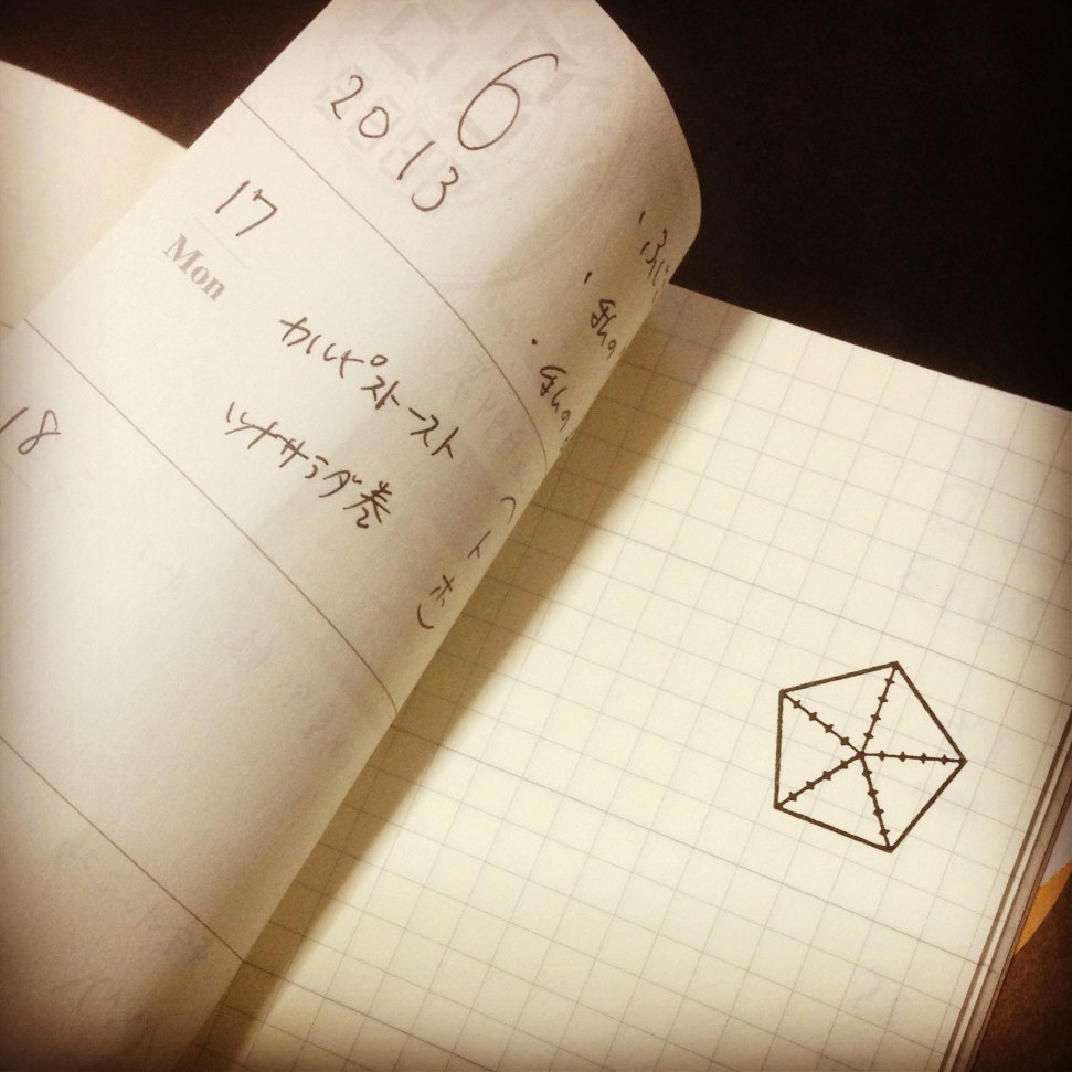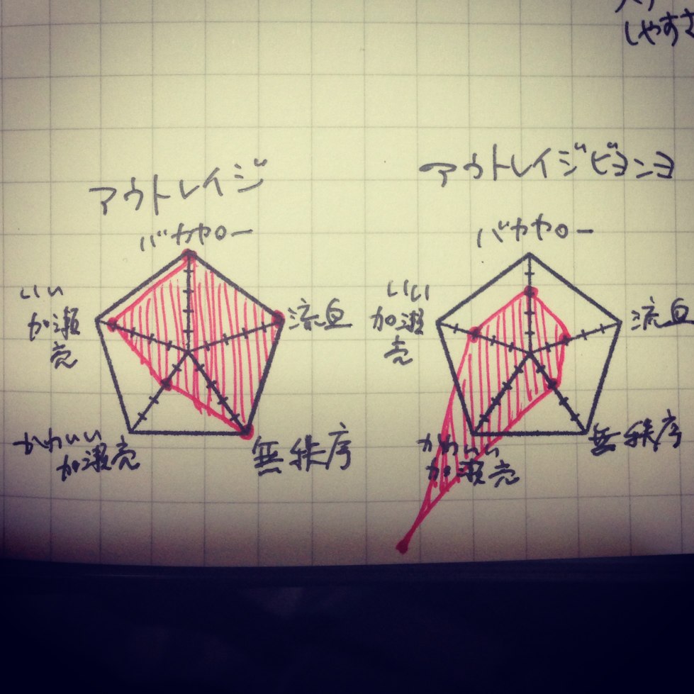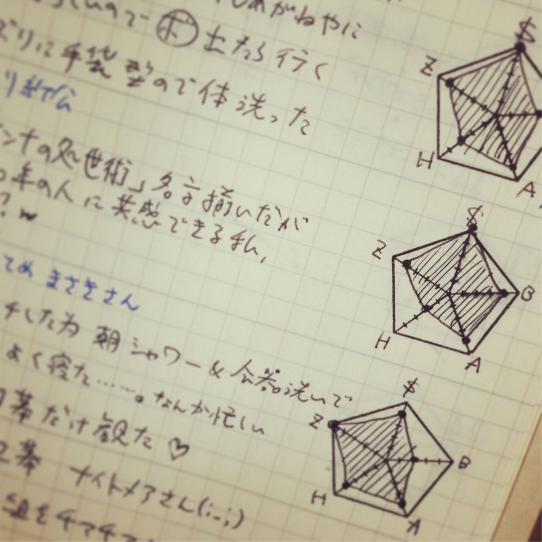 2013/06/26 Category : Stationery OSANPOのレーダーチャートスタンプがおもしろい ★OSANPO ShoppingExcel使やぁいいところを、わざわざ手でレーダーチャート描かせるそのアイディアが可愛くて、思わず購入。衝動買いだったんだけど、日記に使っているトラベラーズノート週間フリー(ホライゾンの方)の一日分の高さにぴったりでほくそ笑みました。届いたその日にさっそく描いてみた、映画『アウトレイジ』と『アウトレイジ ビヨンド』の比較。これを使って何かを評価しようとすると、容赦無く客観視できるのがいいですね。一日の終わりに、その日の各分野の満足度を書くことにしてみました。内省的な気分になるプレイ、楽しいです。どれが何を示しているかは、ご想像にお任せします☆〜(ゝ。∂) [5回]