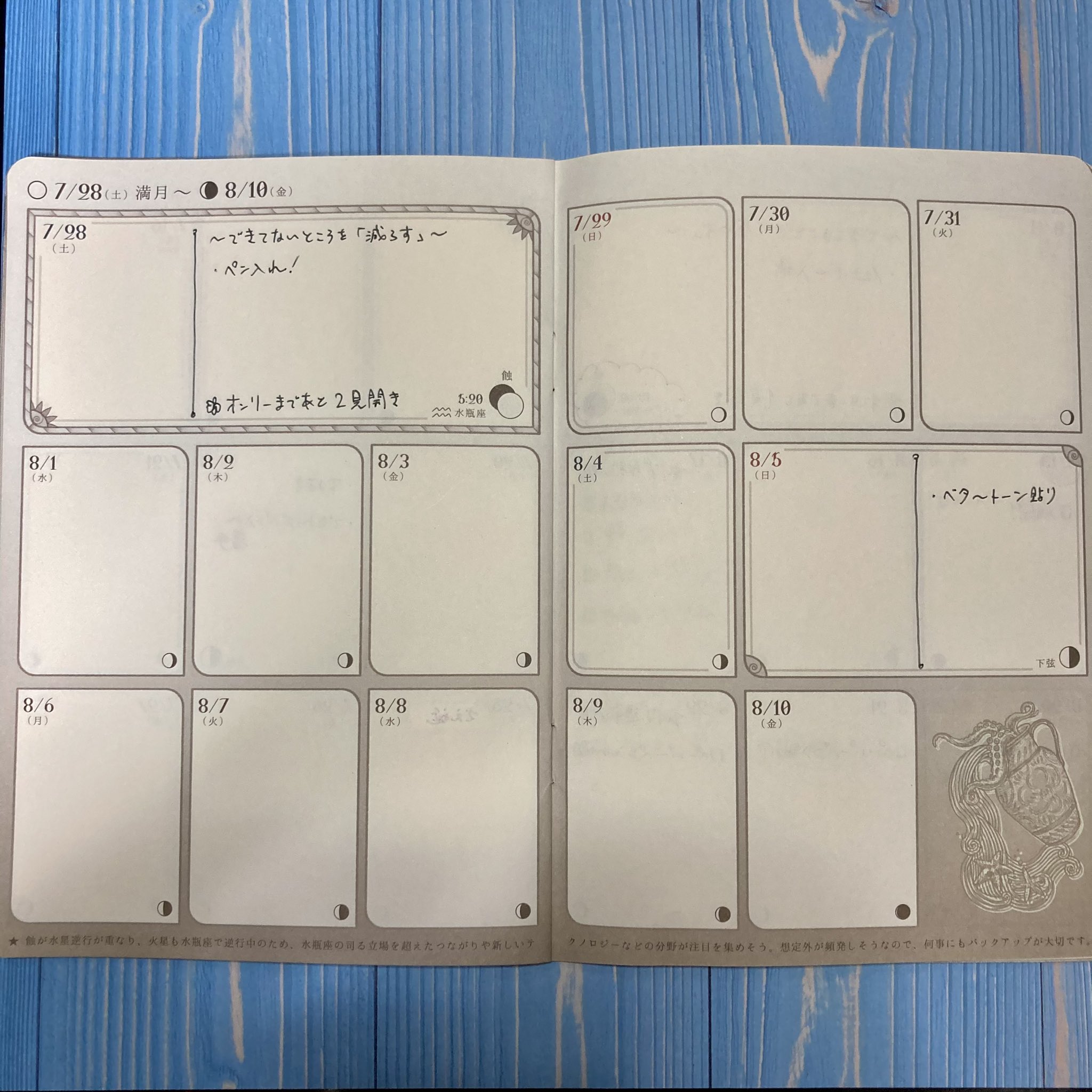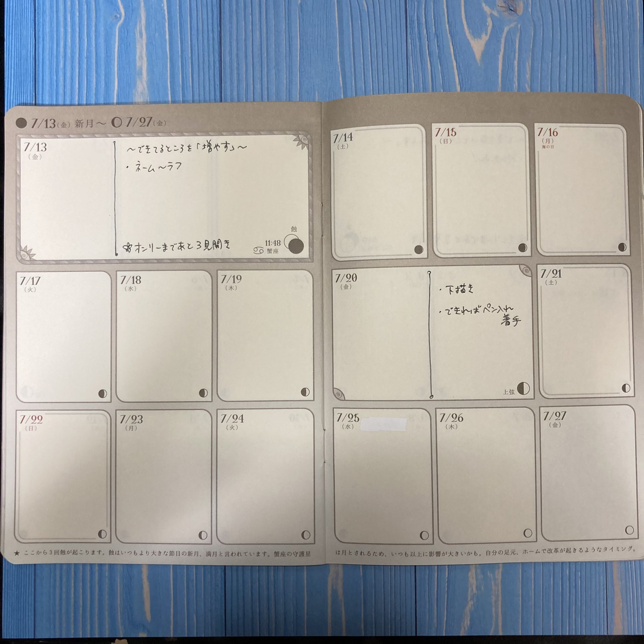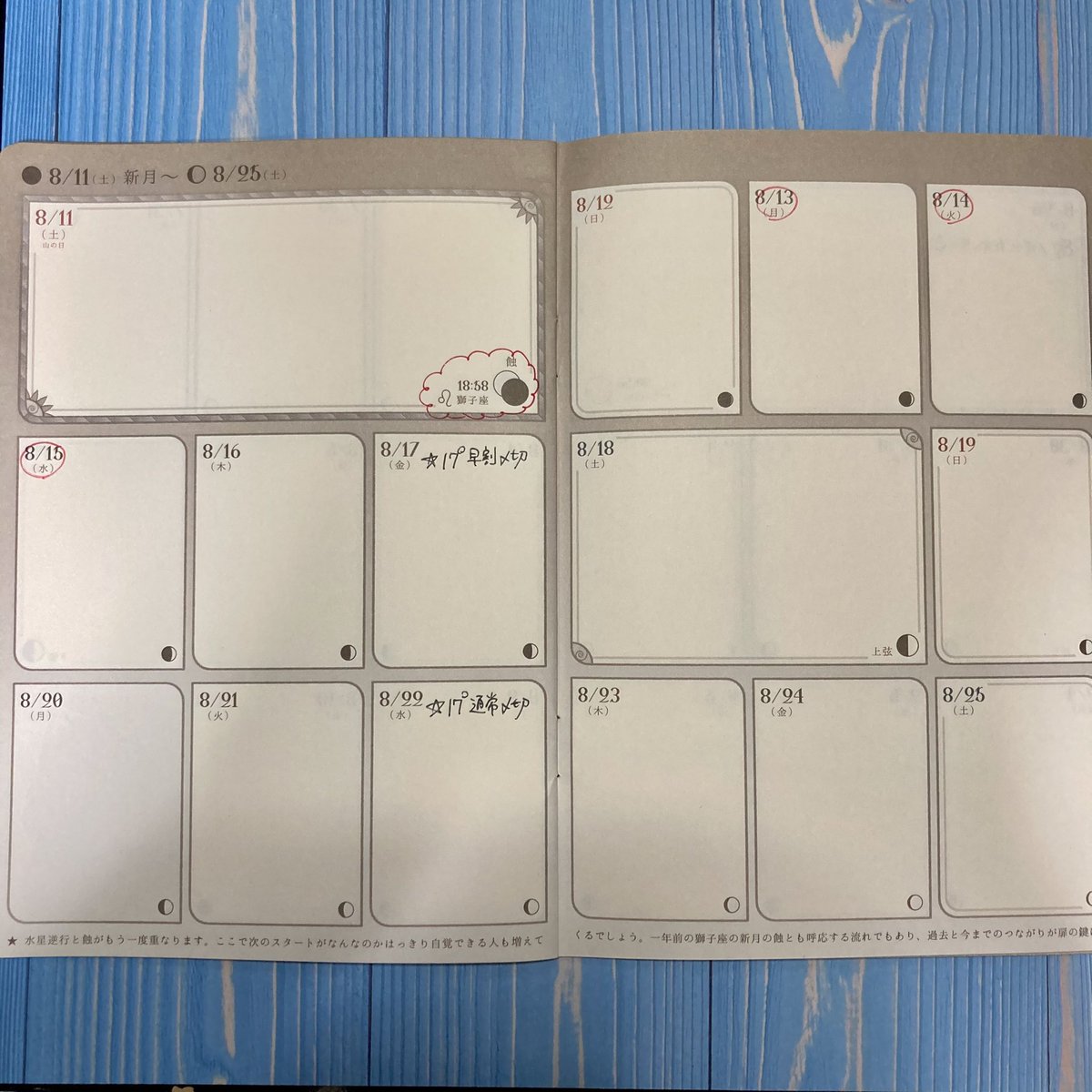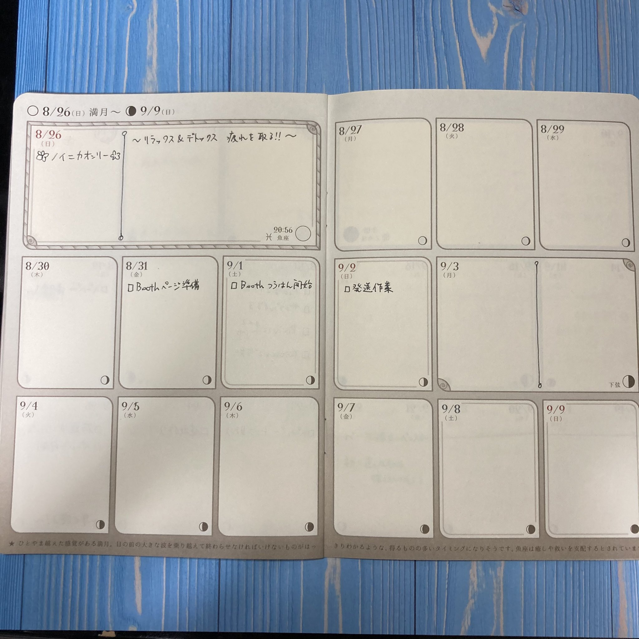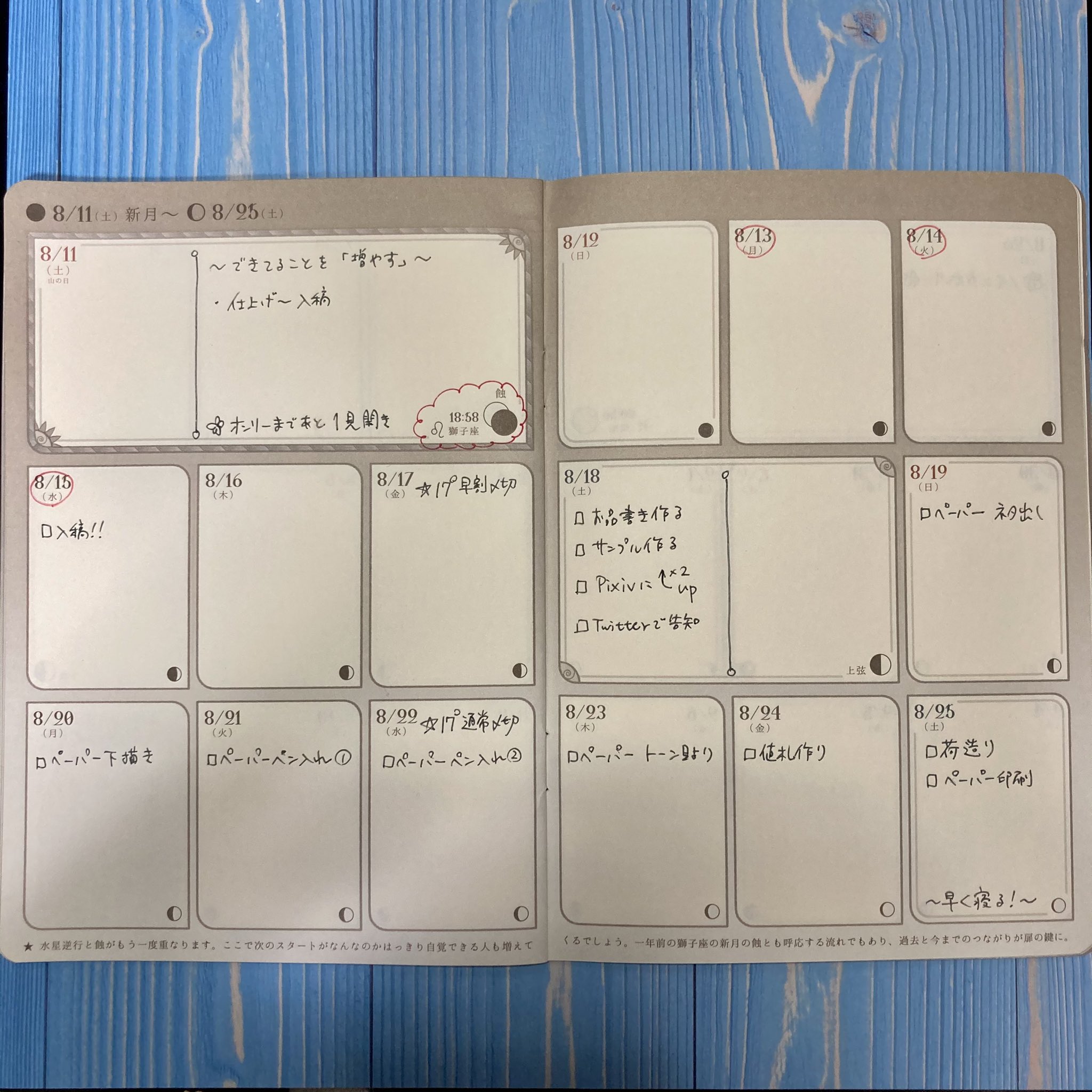 2021/02/12 Category : Stationery #MoonPlanner で同人誌製作スケジューリング 再開のあいさつ記事で「月に1冊ペースで推しカプの同人誌を作っていた」と書いたかと思うのですが、それを可能にしていたのはMoon Plannerという、月の満ち欠けに沿ったフォーマットの手帳を使ってのスケジューリングでした。Twitter・InstagramにUPしたのと同じ内容ですが、流れずに留まる場所としてここにも載せておきます。(※過去の白紙ページを使った、架空のイベントの例です。)1.まずはイベント日を書きます(8/26)。 2.逆算して、入稿〆切を書きます(8/17、22)。 3.入稿目標日を書きます(8/15)。イベント前にやること(沢山)も書きます。私はイベント当日まであと何見開き残っているかカウントダウンも書いてます(1見開き約半月)。 4.満月・新月(見開き左上、3倍の幅)と半月(右ページ中段、2倍の幅)を区切りにして、逆算しながらその期間にやる作業を割り当てます。 5〜6.さらに逆算して、各期間に作業を割り当てていきます。 新月→半月→満月→半月の間隔は約1週間です。ご自分のペースで、毎回どの作業に何日くらい掛けてるか思い出しながら、作業の割り当てをしてください。これで6/28の満月あたりからぼちぼち作業しなきゃな〜と見当がつきました。7.イベント後も、通信頒布などやることがあるなら、それも書いておきます。 私の場合ですが、平日・休日問わず、満月・新月・半月を作業期間の区切りにすることで、平日の夜も少しずつでも作業を進めたり、逆にその期間内に収まらなくても、次の休日で取り戻す! と考えられるようになりました。つまるところ推しの本が出せれば手段はどうでも良いのですが、私はより確実に推しの本を出したいので、こうやって脱稿の確実性を上げています……という、あくまで「一例」です!! みんな! 推しの本、増やしていこうな!!! [0回]PR